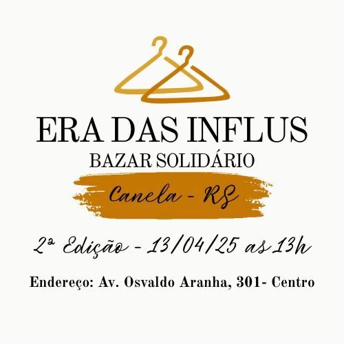 A segunda edição do Bazar Era das Influs vai ser realizada dia 13 de abril em Canela, na Avenida Osvaldo Aranha, 301, centro. O evento tem entrada gratuita e inicia às 14 horas.