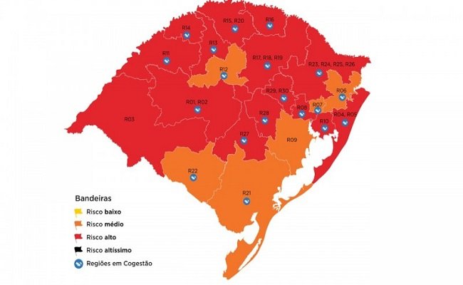 Cogestão – Entre as 19 regiões Covid que aderiram ao sistema de cogestão regional, as 14 que estão em bandeira vermelha podem adotar os protocolos próprios compatíveis até o nível de restrição da bandeira laranja (Gramado e Canela inclusive). Já as cinco regiões classificadas em laranja que estão na cogestão podem utilizar protocolos de bandeira amarela, se estiver previsto no plano de cogestão.