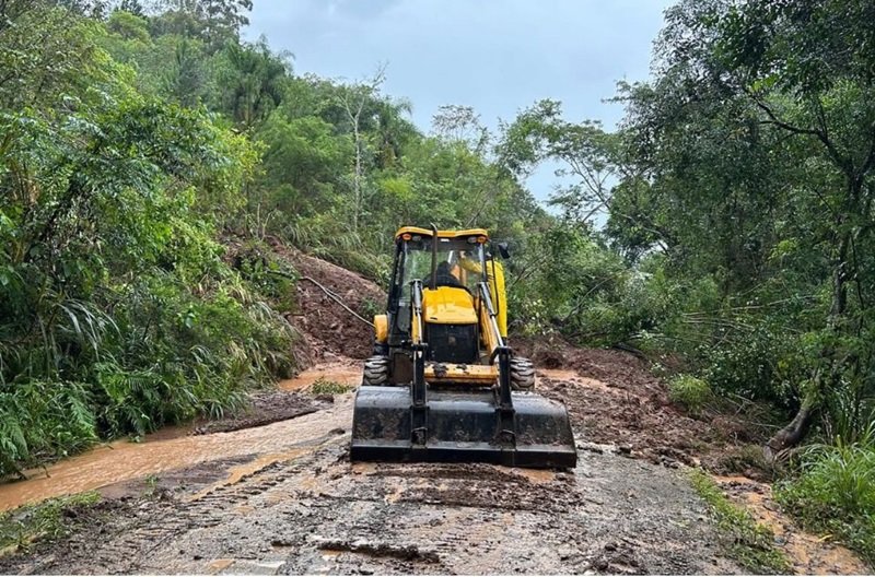 Forças de Segurança e Prefeitura de Canela trabalham na desobstrução de vias interditadas no interior por queda de barreira. Créditos: Prefeitura de Canela
