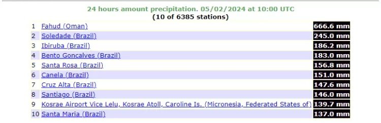 A lista é liderada por Fahud, em Omã, que teve 666,6 mm de chuva. O Ogimet calcula índices de precipitação em 6.385 estações pelo mundo. Em Canela, a estação meteorológica está localizada no Aeroporto.